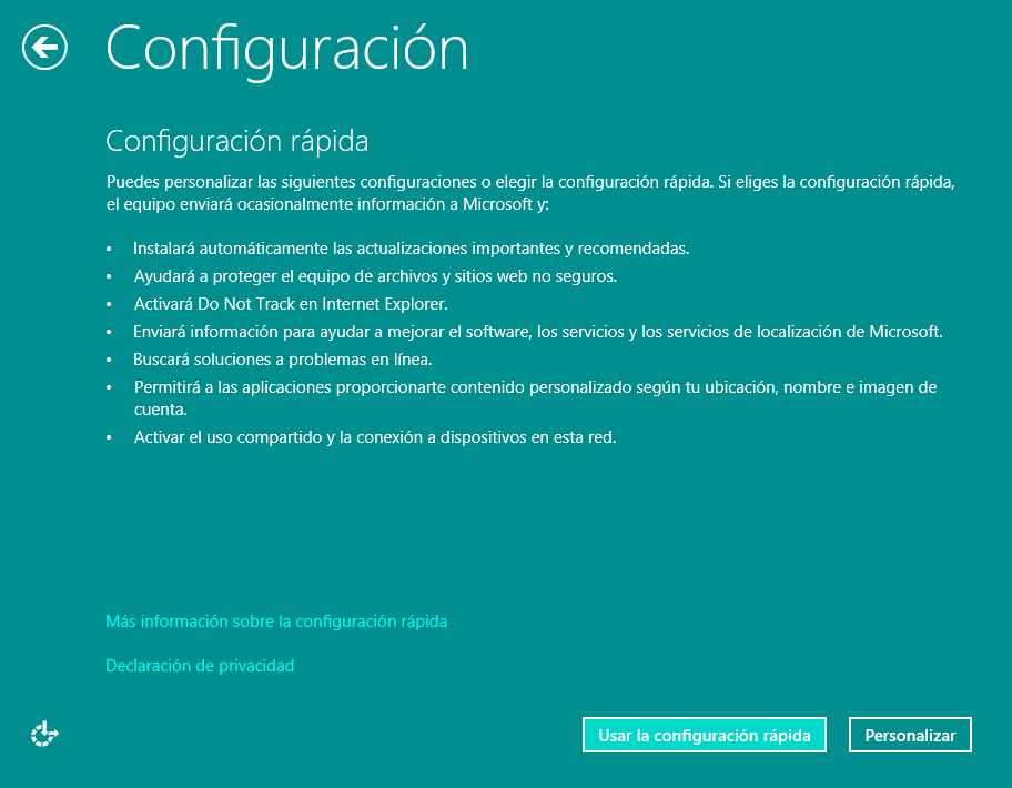 Tenemos dos opciones, optar por la configuración rápida (más tarde podremos configurar el equipo a nuestro gusto) o elegir la configuración personalizada. Como veis en la captura de pantalla, la personalizada nos permite dejar configuradas algunas opciones.