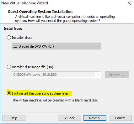 Hay que seleccionar que vamos a instalar el SO despues. Esto pasa si usas las ISO’s de Technet. Vmware en la instalacion con ISO, te pide el serial number y ya lo intenta agregar a la instalacion. Las ISOS de evaluacion, como ya llevan al serial integrado de 180 dias, no les acaba de gustar este metodo y de ahi el error.