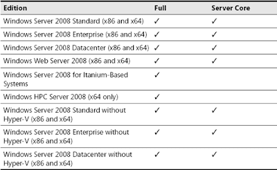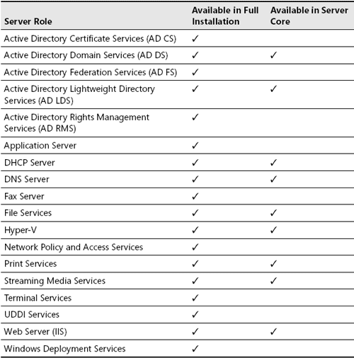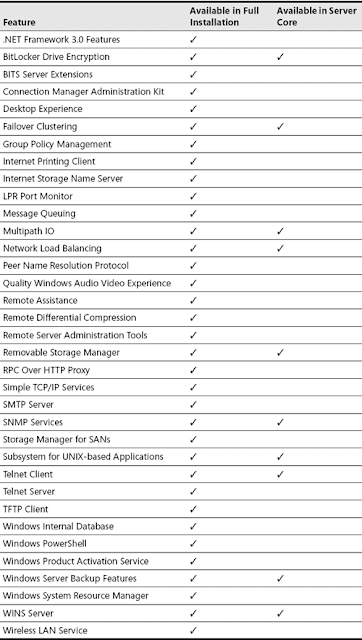 Una instalación Server Core incluye sólo un número limitado de funciones de servidor en comparación con una instalación completa de Windows Server 2008. La Tabla 1-3 compara las funciones disponibles para las instalaciones básicas, tanto completa y Server de Windows Server 2008 Enterprise Edition.