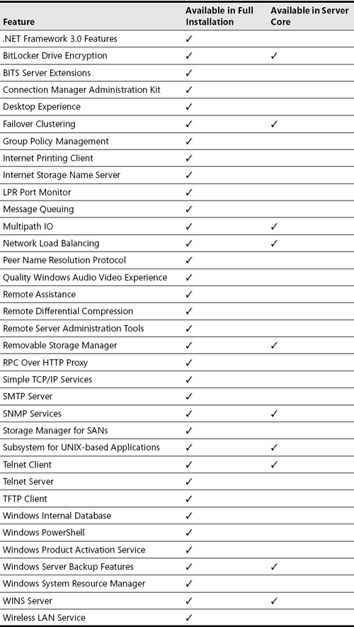 Una instalación Server Core también soporta sólo un subconjunto limitado de las funciones disponibles en una instalación completa de Windows Server 2008. Tabla 4.1 se comparan las características disponibles para las instalaciones básicas, tanto completa y Server de Windows Server 2008 Enterprise Edition.