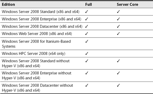 Tabla 1-1 Windows Server 2008 ediciones y su apoyo a las opciones de instalación