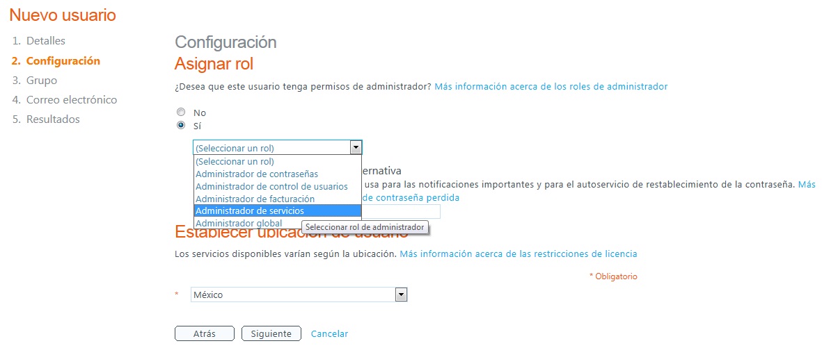 en este ejemplo dare permiso como «Administrador de Servicios» y le asignare la ubicacion, damos clic en siguiente: