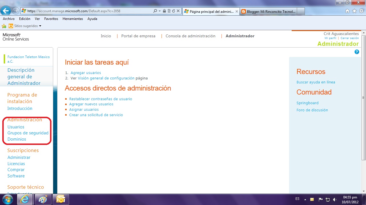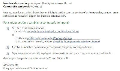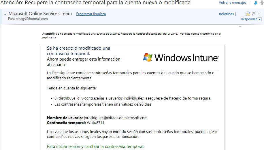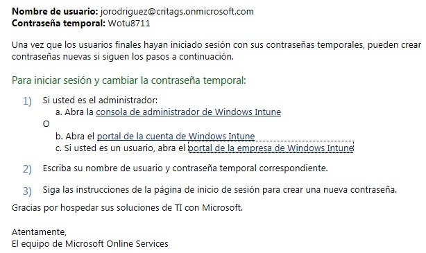 para la consola de administrador el nuevo usuario soporte@critags.onmicrosoft.com Abra el portal de la cuenta de Windows Intune