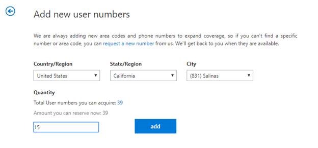 Selecciona el país, estado y ciudad. Y escribe la cantidad de numeros que quieres reservar, da click en Add.
